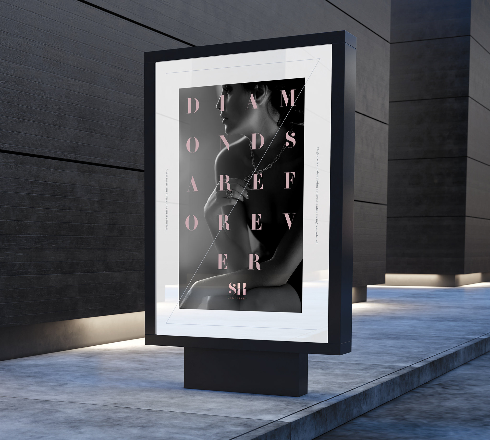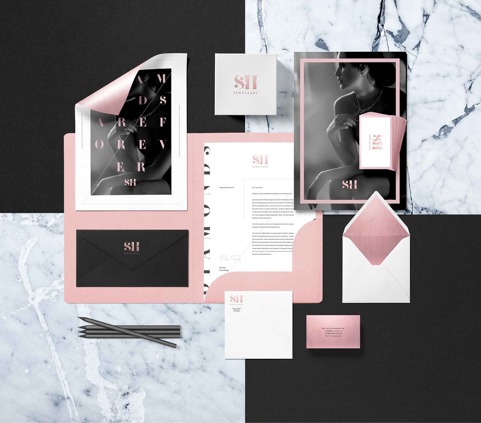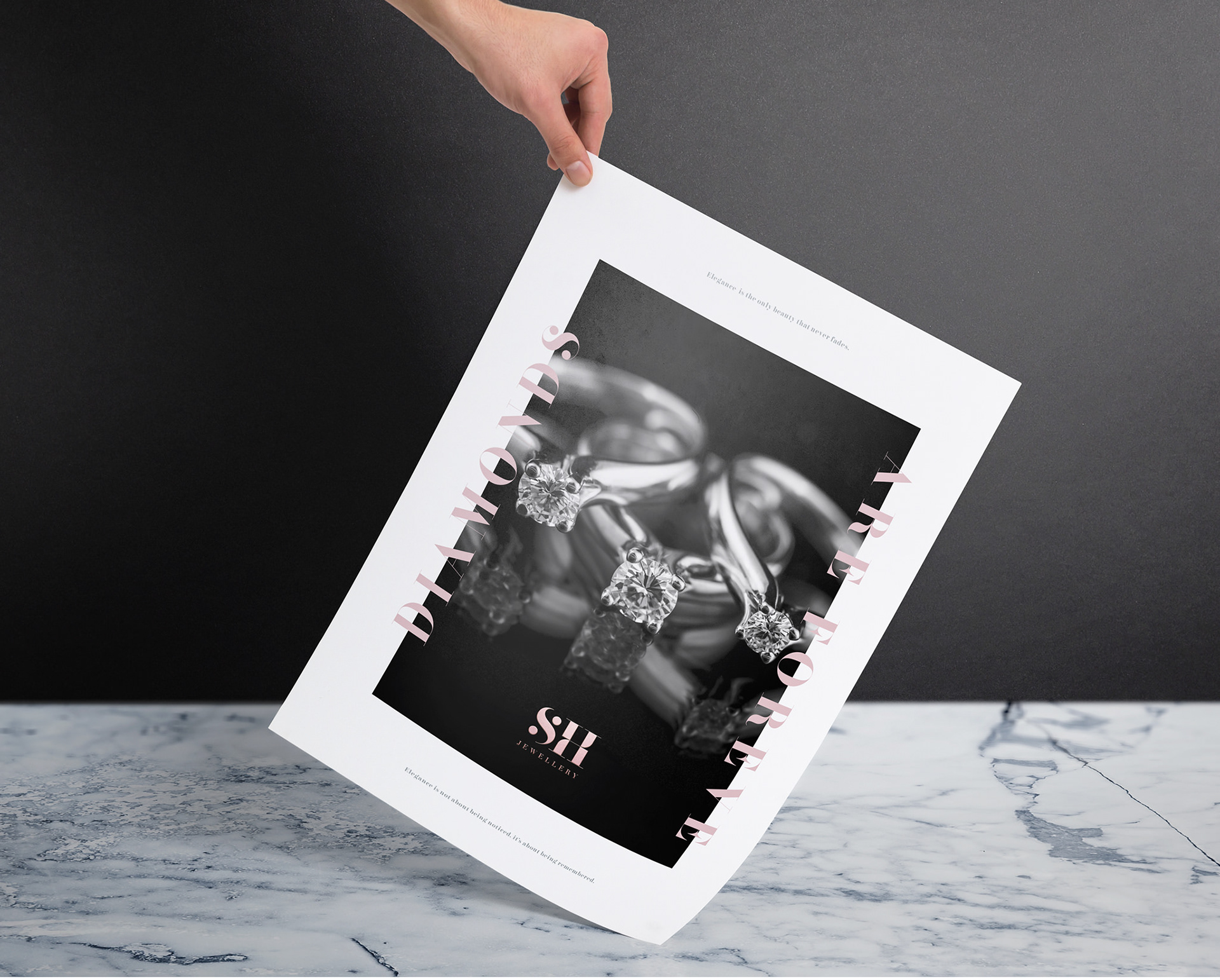SH Jewellery store is a premier jewellery store located in Melbourne, Australia. They have a great range of the highest class engagement rings and wedding bands as they source the most beautiful diamonds found around the world. They asked me to rebrand their current branding into a sophisticated modern look and feel to compliment their premium jewellery. We wanted to create a design that was purely typographic, a logotype, that can easily be recognized and engraved on the jewels, packaging and signage.